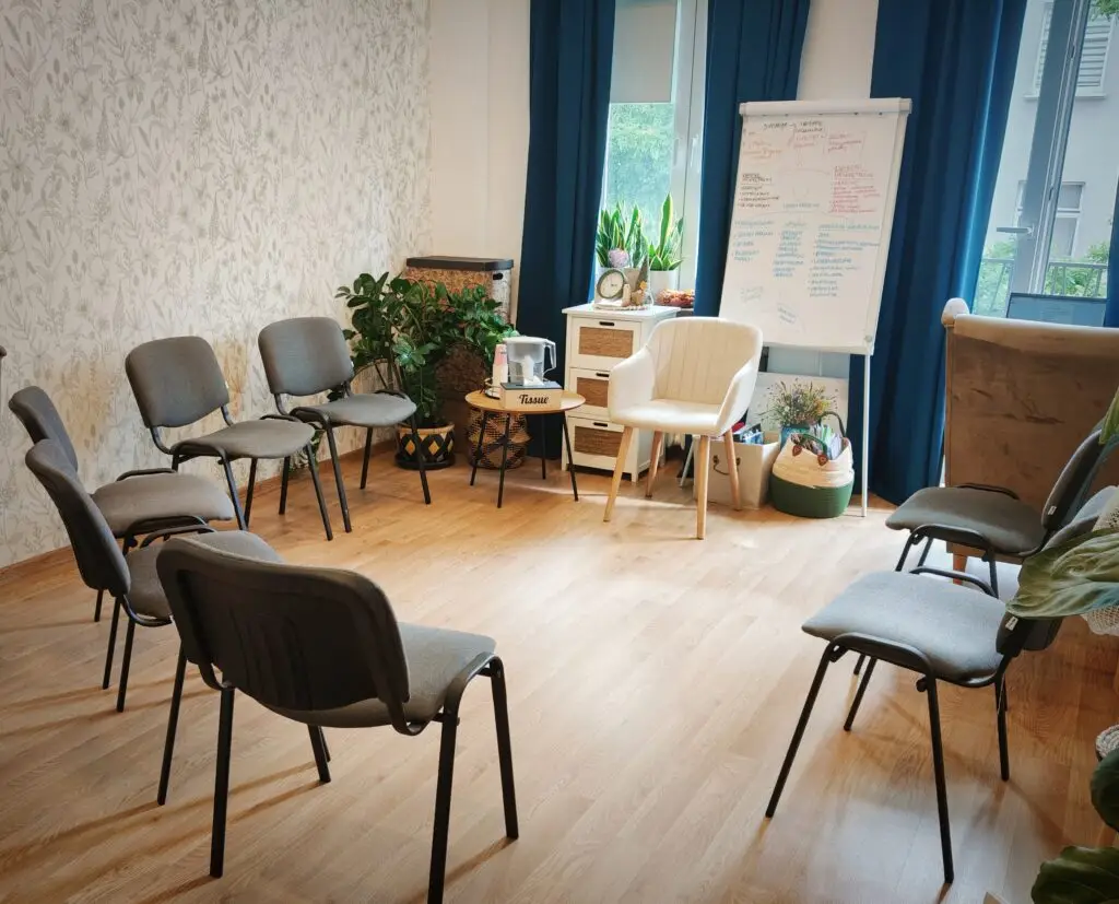 - przestrzeń do praktycznych ćwiczeń, które dotykają emocji i uruchamiają proces zmiany (np. praca z krzesłami, wyobrażeniowe zmiany skryptów, wyobrażenia grupowe),
