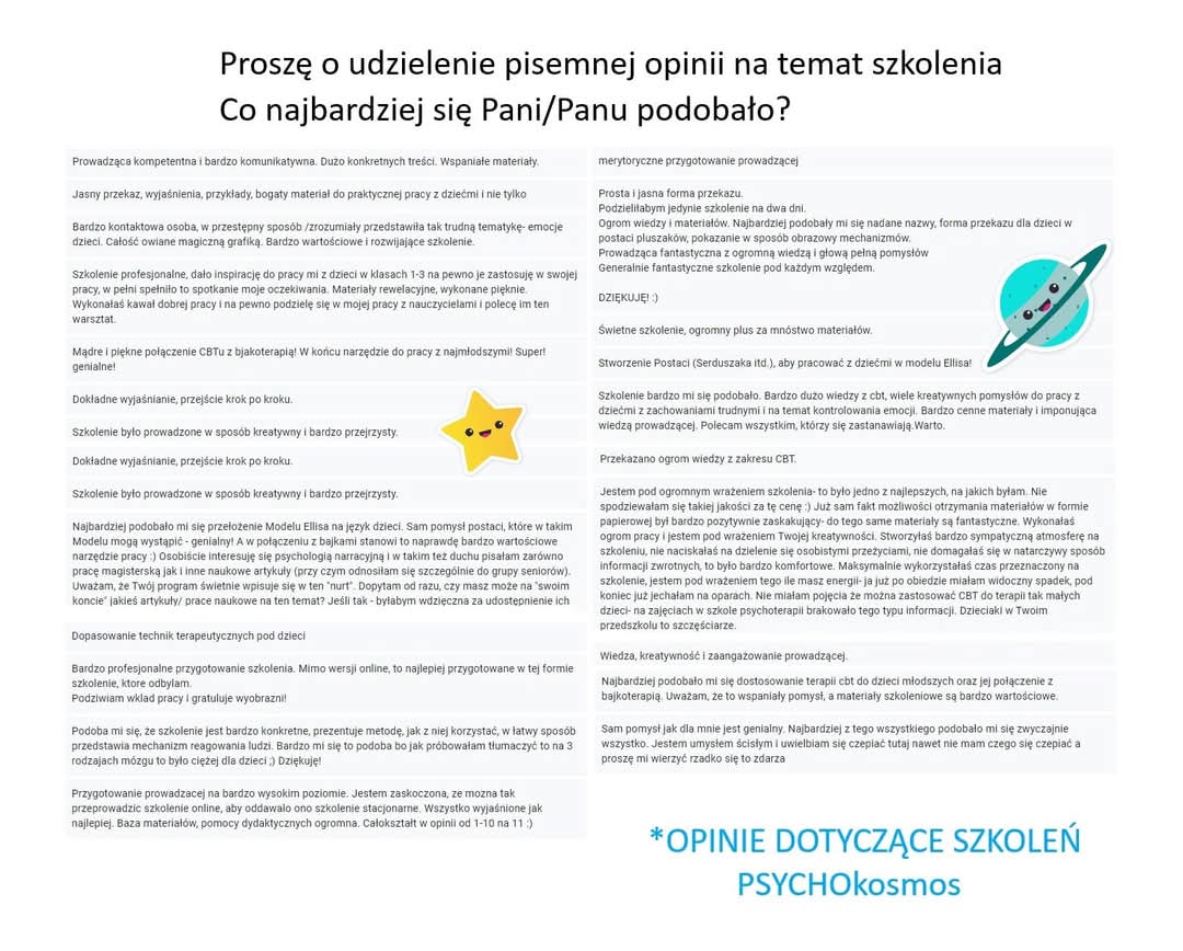 Szkolenie i innowacyjny program profilaktyki zaburzeń psychicznych u dzieci “PSYCHOkosmos” integruje psychoterapię poznawczo-behawioralną z bajkoterapią. Kierowany jest do psychologów, pedagogów, nauczycieli, studentów ostatnich lat psychologii/pedagogiki i wszystkich specjalistów chcących wzbogacić swój warsztat pracy.